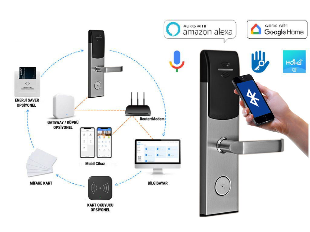 - Bluetooth, Kart, gateway ile kilit uzaktan (resepsiyon) yönetilebilir ve açılabilir.