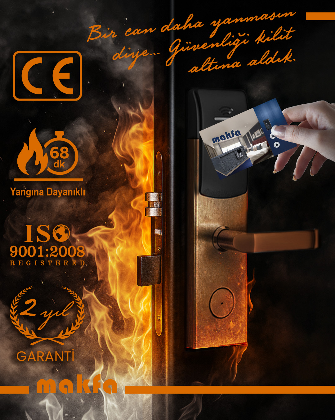 Oteller için tasarlanan özel kilitlerimiz, yüksek yangın dayanımı ve şık tasarımı bir arada sunar. Misafirlerinizin güvenliği bizim önceliğimizdir; ürünlerimiz uluslararası yangın güvenliği standartlarına uygun olarak test edilmiş, yangın dayanım raporu ile belgelenmiş ve tüm yangın testlerinden başarıyla geçerek yaygın sertifikasını almıştır.