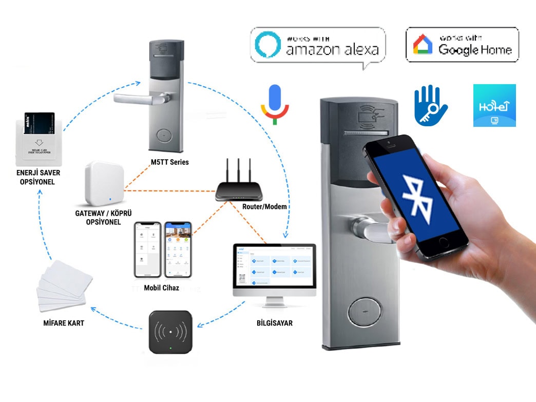 - Bluetooth, Kart, gateway ile kilit uzaktan (resepsiyon) yönetilebilir ve açılabilir.